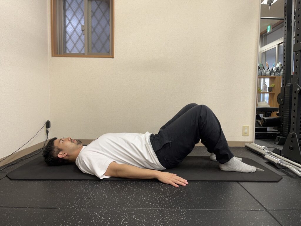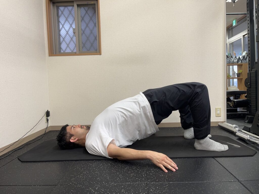 仰向けで膝を曲げてお尻を床から持ち上げるトレーニング。
