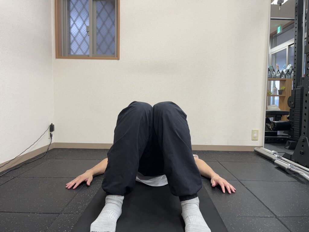 3.息を吐きながらお尻を持ち上げ、肩〜膝が一直線になる位置で2秒キープ