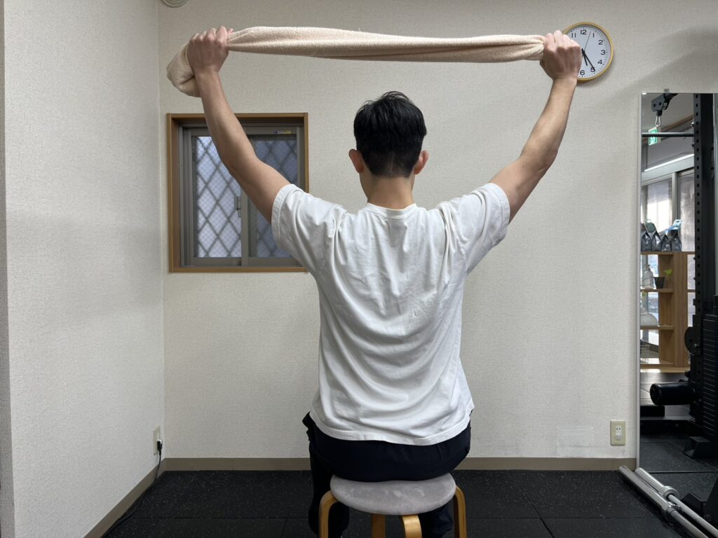 1.タオルを握って両手を上げる